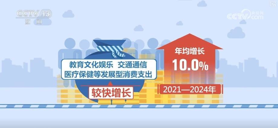 从支出看配资伐,教育文化娱乐、交通通信、医疗保健等发展型消费支出较快增长,2021—2024年年均增长10.0%;居民服务性消费支出年均增长9.5%,比商品性消费支出快3.8个百分点。