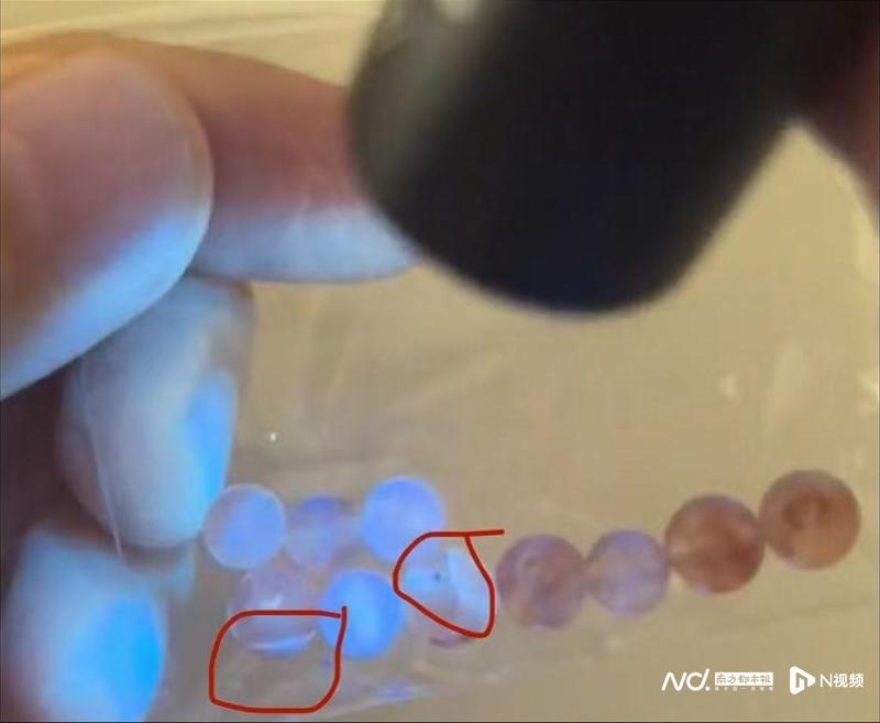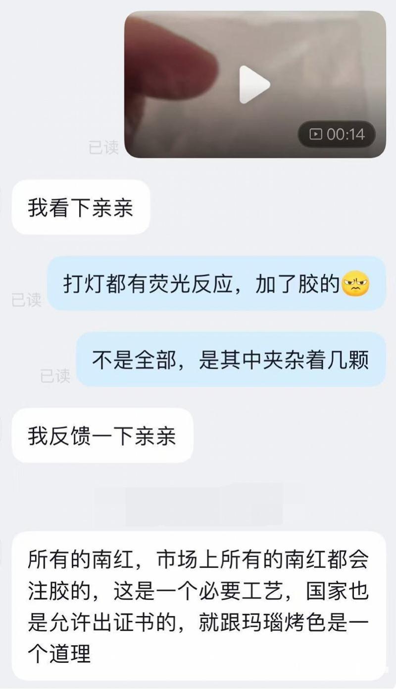 无独有偶,广州的严女士在抖音直播间购买了数十颗南红散珠(一种玉石种类),回来用紫光灯检测,发现有明显的“注胶”痕迹。询问客服后对方坦然承认,“市场上所有的南红都会注胶,这是一个必要工艺,国家也允许出证书的,和玛瑙烤色是一个道理”。但严女士告诉南都记者,当初在直播间商家并未就此说明,而且作为玉石爱好者,她发现不少直播间主播对南红的惯用话术都是“原矿、无胶、无优化”,她透露:“只有很少的直播间会明确告诉你哪些是染色的、哪些是优化过的。”