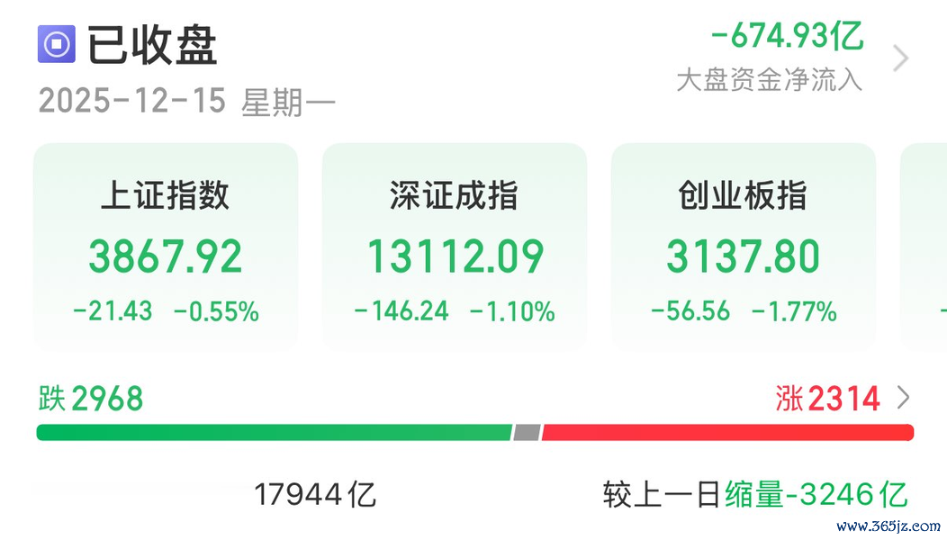 上证报中国证券网讯(记者徐蔚)12月15日,A股三大指数集体调整。截至收盘,上证指数跌0.55%,深证成指跌1.10%,创业板指跌1.77%。全市场成交1.79万亿元,较上个交易日缩量3246亿元。